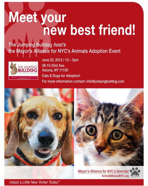 The  van will be parked in front of the Jumping Bulldog,  conveniently located at 28th street and 23rd Ave, just around the corner from the Ditmars Boulevard N/Q stop, and en route to Astoria Park, so swing by on Saturday between noon and 3pm to say hello and meet the adoptables – we hope to see you there!